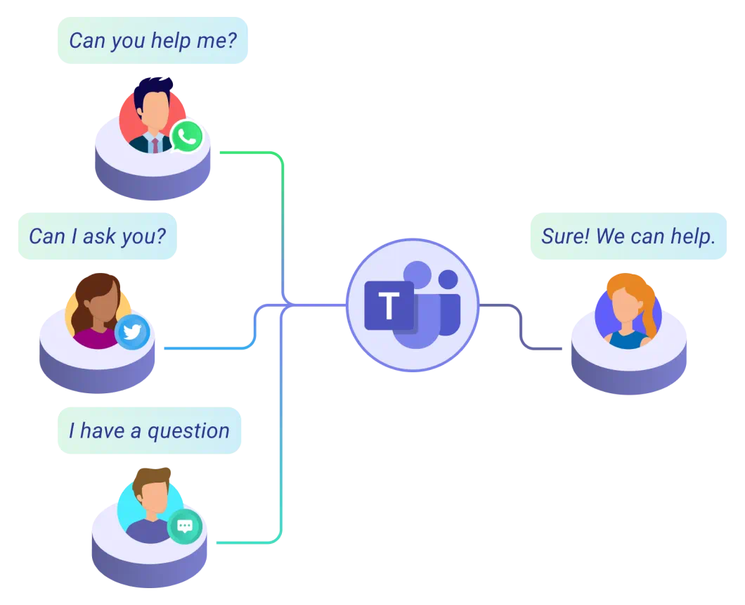 Nutzen Sie Microsoft Teams als Plattform und machen Sie es zur zentralen Kommunikationsdrehscheibe in Ihrem Unternehmen, indem Sie es nahtlos mit WhatsApp, Facebook, Twitter, SMS, Webchat, Bots und mehr integrieren!